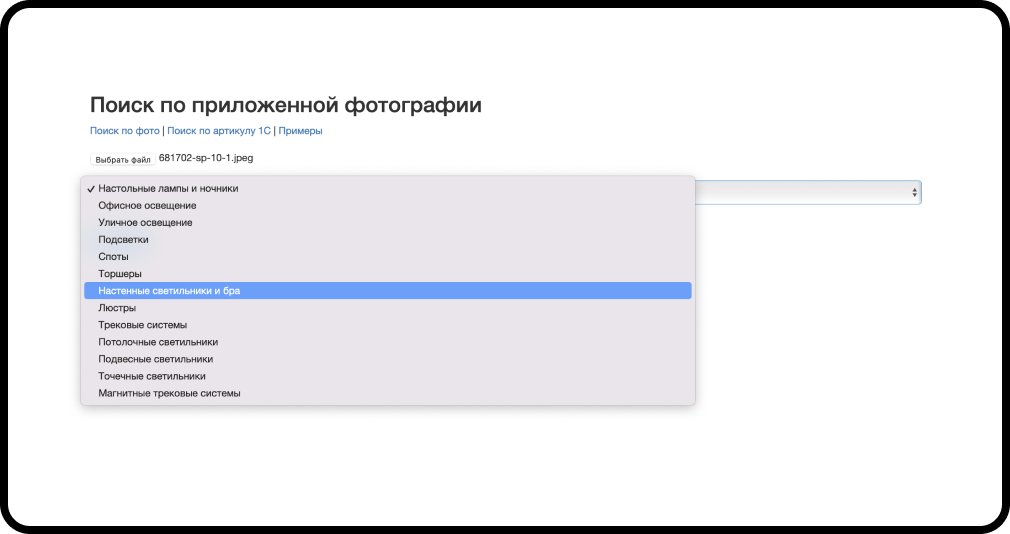 Сервис имеет несколько обученных моделей, которые по изображению светильника и выбранной категории, выдают варианты похожих моделей